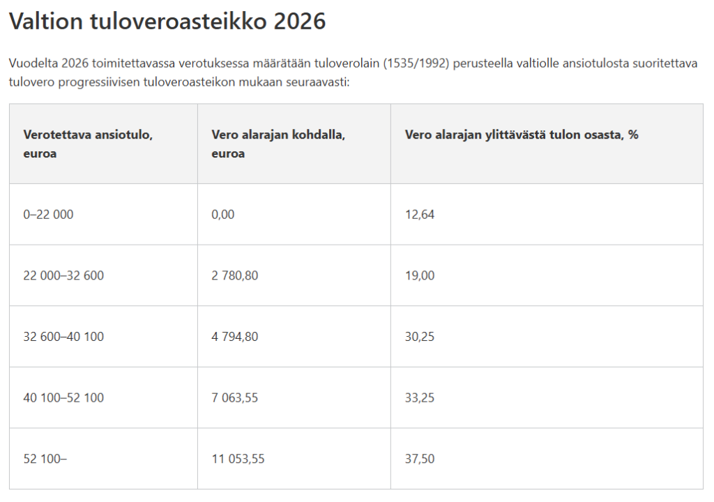 Uusi verokortti astuu voimaan 1.1.2026. Verokortin tuloraja on laskettu koko kalenterivuoden ajalle eli se sisältää yhteensä 12 kuukauden suoritukset.